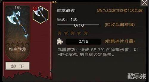 维京战斧的兵装特效目标HP小于50%必定暴击,3星生命上限20%,双持翻倍,4星暴击附加迟缓,5星迟缓5层变冰冻1秒。