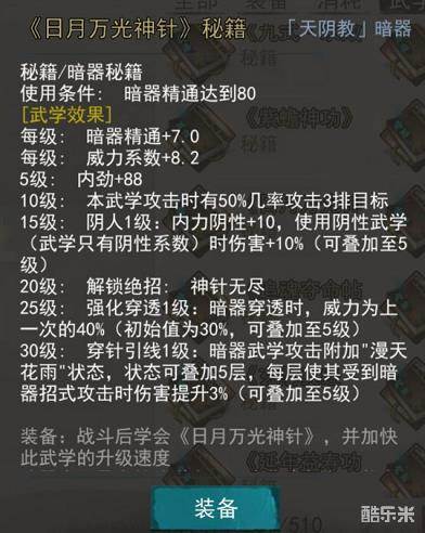 日月万光神针20级解锁绝招,自身附带多种词条,可以给其他暗器做辅助,攻击时有概率附加流血,可以考虑做流血套路。