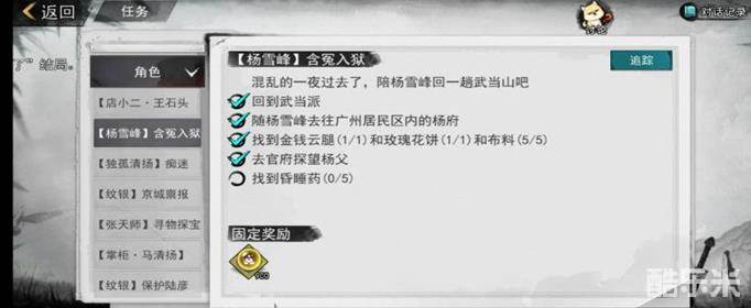 玩家们可以发现昏睡药的寻找任务是在杨雪峰含冤入狱的这个任务中的,那么玩家们就需要看看能不能从杨雪峰身上找到这个昏睡药的配方,如果事没有关系的话,那我们就需要去寻找一下这个昏睡药能不能在药店买到,我们可以去大理寻找一下,那边的药物比较齐全一些。