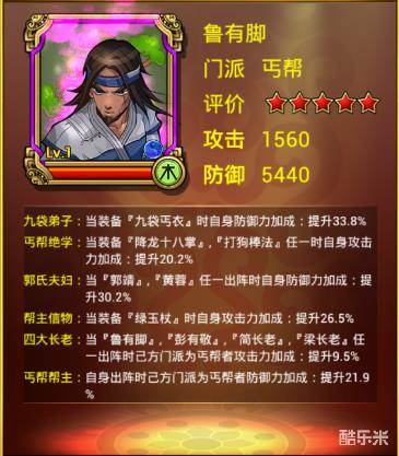 与黄蓉、郭靖同时出阵有高加成,自带“污衣派”和“丐帮帮主”能为团队丐帮侠客带来12.7%攻击和21.9%防御加成,称得上是五星卡牌中的极品。