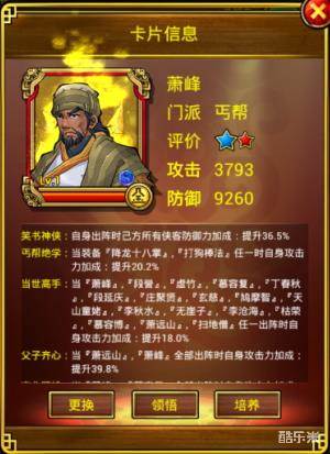 丐帮六星卡片,单是“缘分”配合郭靖、黄蓉已经可以提高63.6%的攻击和73%防御,“丐帮帮主”的相互加成使全队的防御达到恐怖级别。如果再加上同为丐帮帮主的耶律齐和萧峰,队伍战力足以傲视天下其他门派。
