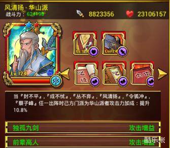 蔡子峰和岳肃是这个阵容的其他两张必备六星卡,不是因为他们是华山少数的六星卡,二十因为他们分别有剑宗宗师(每个侠客加31.8%攻击力)和气宗宗师(每个侠客加43.8%防御力),这么牛的团队光环是非常难得的。