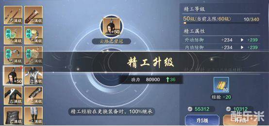 1件装备精工等级从45提升到60需要262个3级精工材料,带来108点功力的提升。