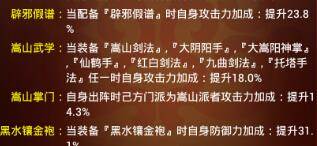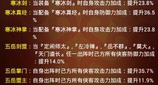 左冷禅能充分利用装备和秘籍加强自身攻防。寒冰剑、寒冰真经、寒冰神掌、嵩山武学、辟邪假谱、黑水镶金袍这六个缘分,能让左冷禅的武器、防具、秘籍各个位置都得到增强。这种能充分利用所有格子,将所有萝卜都填上坑的特性,即使在六星卡片中也相当少见。而且加成相当可观,一本寒冰真经提高36.5%的防御可能并不起眼,配合上五岳剑盟也仅仅加到50%的防御。但是左冷禅最可怕的是其来自攻击力的加成,寒冰剑23.8%、寒冰神掌23.8%、五岳掌门35.7%、五岳盟主11.9%、辟邪假谱23.8%、嵩山掌门14.3%一共有121.4%攻击加成,加起来足足一倍有多!