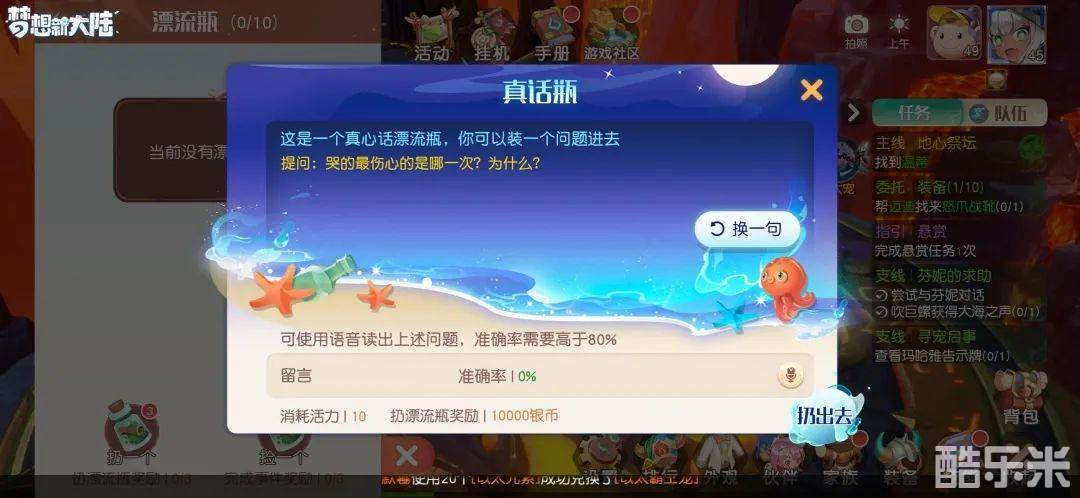 点击主界面左下角聊天框上方位置的【好友】按钮,就可以在游戏关系内看到【漂流瓶】了,大家可以通过它来制造话题,结识更多有趣的灵魂哦。目前每天前3次“扔漂流瓶”和“捡漂流瓶”,都可以获得奖励哦。