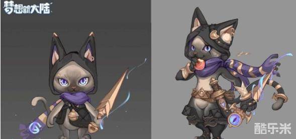 刺客猫作为隐于黑暗的一个角色,身着深色兜帽,手持匕首,脖颈间旋绕暗紫色丝制围巾,而其暹罗猫的设定正好对应了隐于黑夜的这个角色特点。
