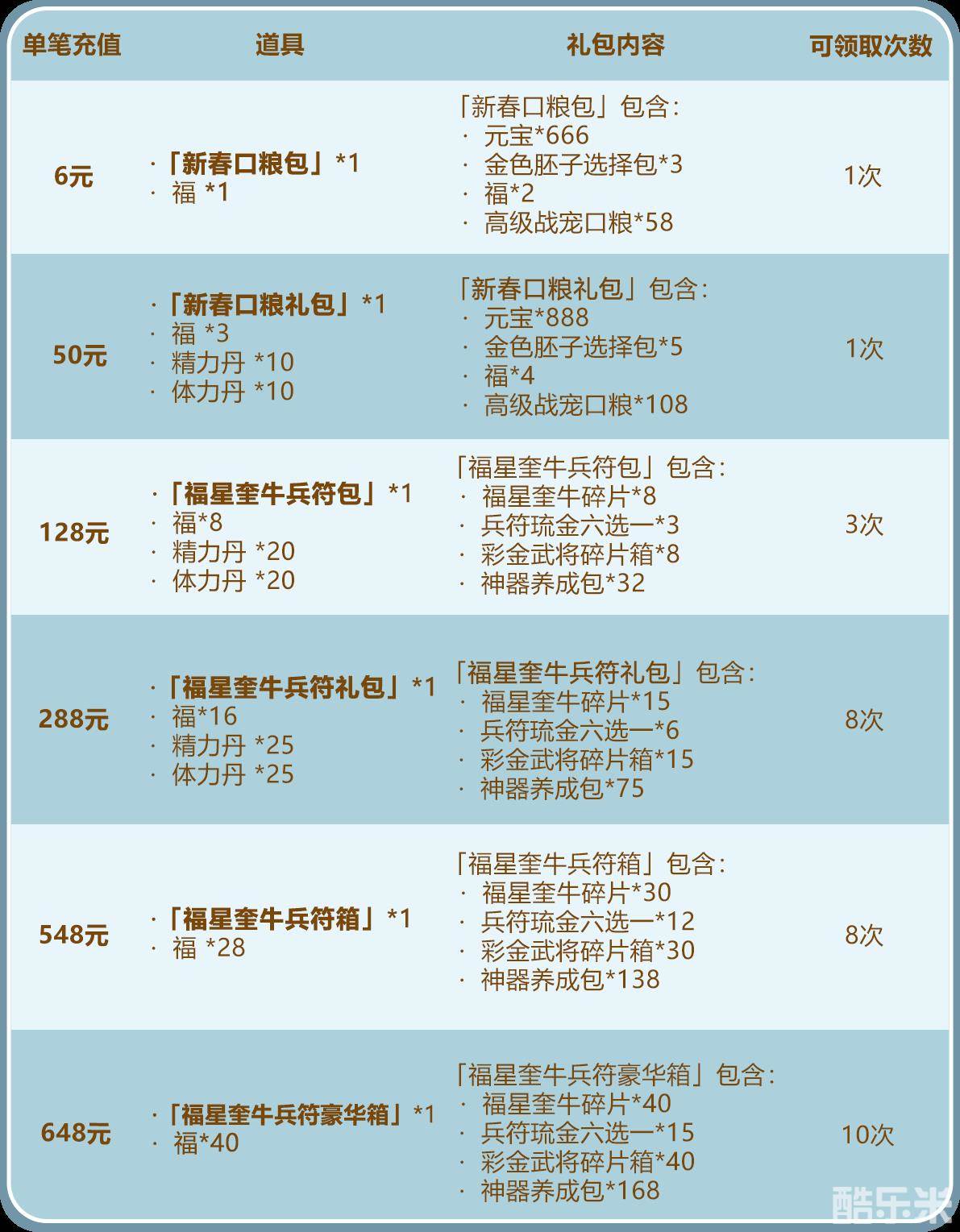 在活动期间少年们单笔充值至指定金额,即可获得福星奎牛碎片、兵符琉金六选一、彩金武将碎片箱、神器养成包、福等资源: