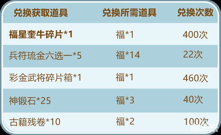 「福」可用来兑换福星奎牛碎片、兵符琉金六选一等稀有资源: