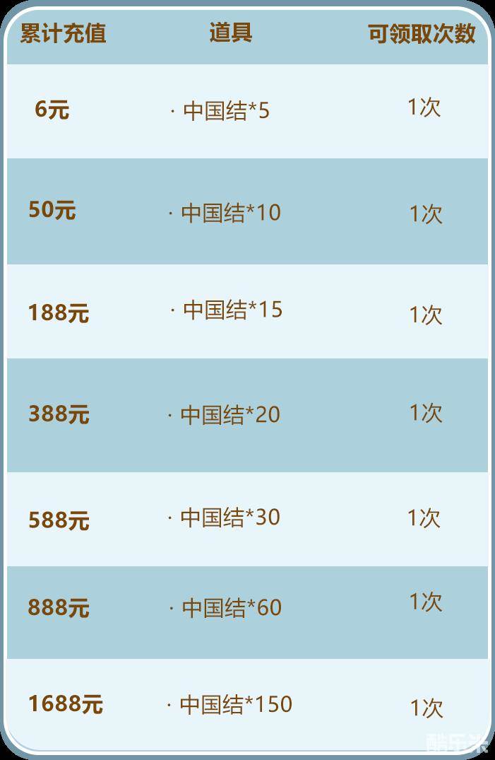 欢度新春!少年们累计充值达到指定金额,即可领取中国结!中国结可在限时活动中兑换各种稀有琉金资源!