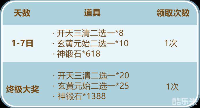 1-7日可领取:「开天三清二选一」*8 或 「玄黄元始二选一」*10或「神锻石」*618