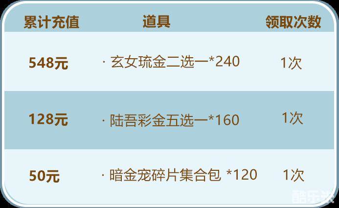 少年们单笔充值指定金额,即可得到玄女琉金二选一、陆吾彩金五选一、暗金宠碎片集合包等珍稀资源,少年们千万不要错过哟~