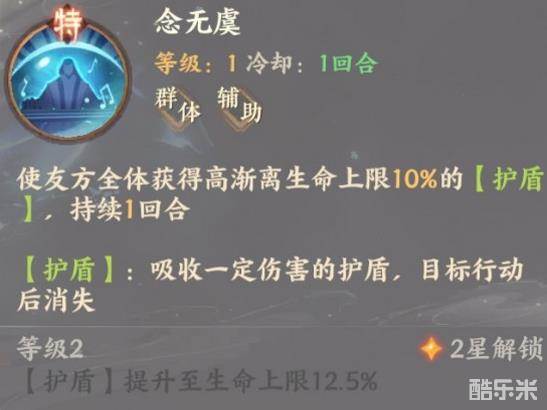 特殊技能“念无虞”,可以使得友方全体获得高渐离生命上限10%的护盾,持续1个回合。护盾可以吸收伤害,但会在目标行动后消失。技能提升至lv3,该比例将提升为15%。