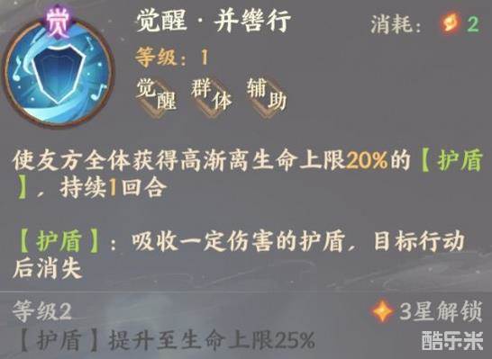 觉醒技能“并辔行”,进一步强化的“念无虞”,可以使得友方全体获得高渐离生命上限20%的护盾,持续1回合。技能提升至lv3,该比例提升至30%。