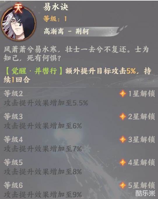 与荆轲组成羁绊,可获得“易水寒”技能,强化觉醒技能并辔行,可以额外提升目标攻击5%,持续1回合。技能提升至lv5,攻击提升效果增加至8%。