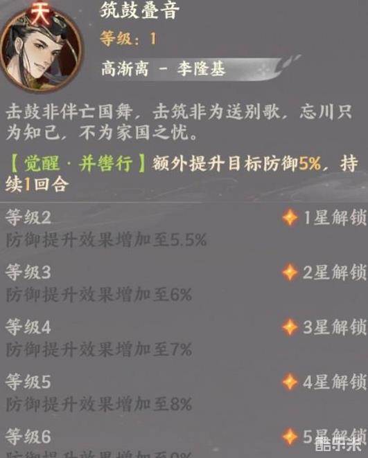 与李隆基组成羁绊,可获得“筑鼓叠音”,强化觉醒技能并辔行,额外提升目标防御5%,技能提升至lv5,防御提升效果增加至8%。