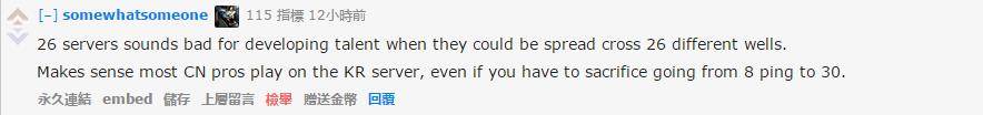 *这么多服务器听起来很不利于人才的培养啊,他们被分成了26个区。这么说来大多数中国职业选手去打韩服就挺合理了,哪怕要牺牲一些延迟。