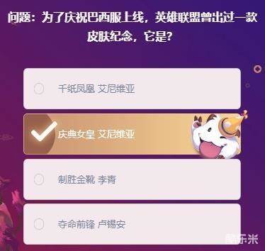 问题:为了庆祝巴西服上线,英雄联盟曾出过一款皮肤纪念,它是?