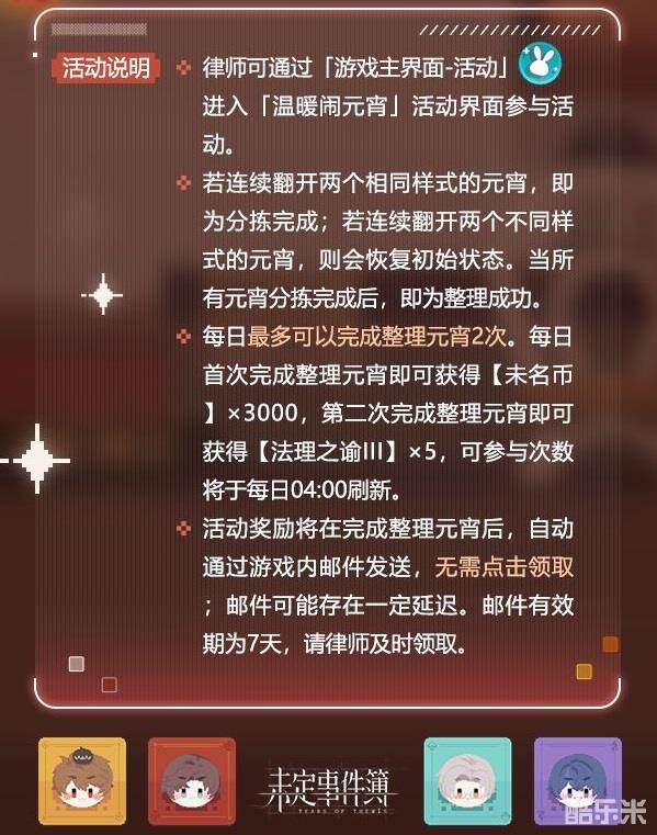 3.每日最多可以完成整理元宵2次。每日首次完成整理元宵即可获得【未名币】×3000,第二次完成整理元宵即可获得【法理之谕III】×5,可参与次数将于每日04:00刷新。