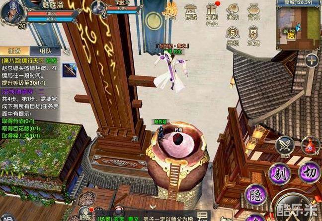 1、收集【药酒】;寻路到皇城医馆,找到旁边的酒坛跳上去(坐标125,60),拾取药酒即可。