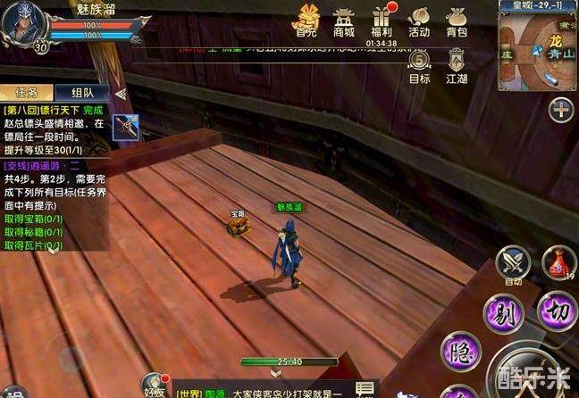 1、收集【宝箱】:到【青山堂】顶层,从中间空隙中跳到下面一层通道上,有四条通道,宝箱在其中一条(-29,-1)上。