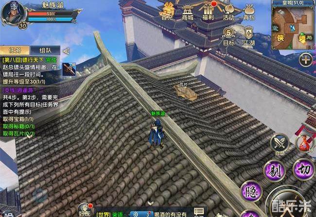2、收集【秘籍】:到【青山堂】顶层,跳到中心点的阁楼顶上面(坐标0,1)