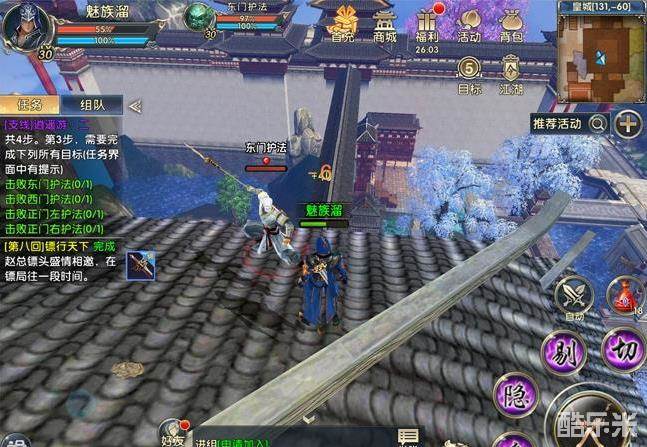 1、东西门护法分别在东西城门楼上面,可以使用轻功先跳到城门旁边的大石头上,然后在跳到城门楼上。