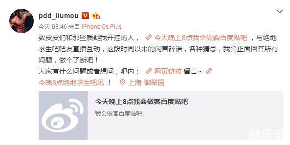 致皮皮们和那些质疑我开挂的人,今天晚上8点我会做客百度贴吧,与绝地求生吧吧友直播互动,这段时间以来的闲言碎语,各种猜忌,我会正面回答所有问题,做个了断吧!