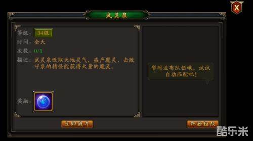 和其他活动副本一样,武灵泉每天有进入次数限制。同时武灵泉必须创建队伍才能进入,支持组队进入的人数为1~4人。