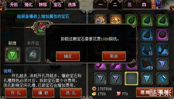 玩家点击已经镶嵌的宝石,弹出该宝石的属性浮动框。操作按钮为“卸下”,点击“卸下”按钮,弹出对话框,如下图: