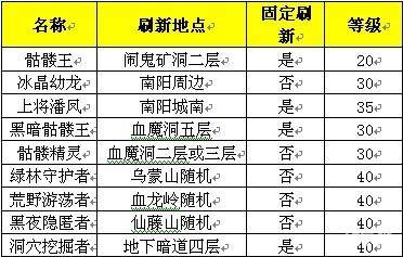 野外BOSS刷新表: