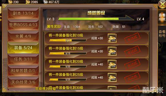 全身强化到3~6~10之后每强化多5级就加成一次。还有绑定元宝领取。