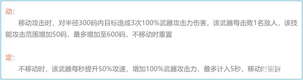 不移动时,该武器每秒提升50%攻速,增加100%武器攻击力,最多计入5秒,移动时重置