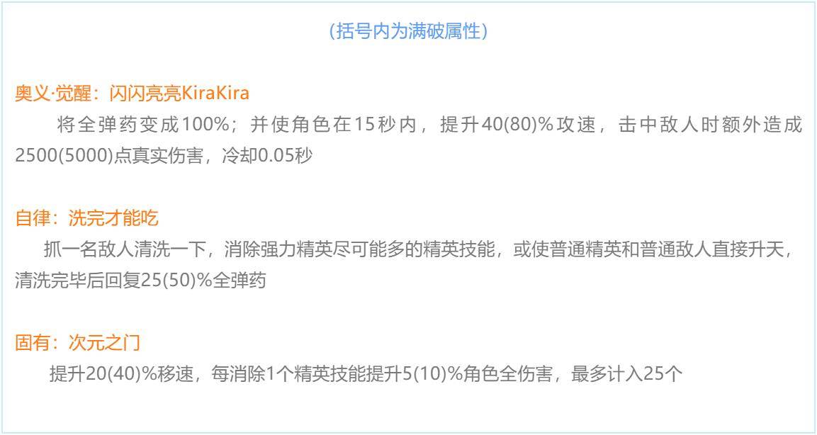 将全弹药变成100%;并使角色在15秒内,提升40(80)%攻速,击中敌人时额外造成2500(5000)点真实伤害,冷却0.05秒