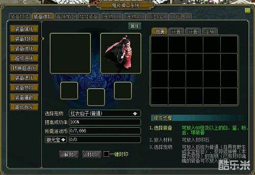 另外,装备封印只能使用后缀名为野生、宝宝、变异、神兽的宠物才能参与。在封印变异或者由变异羽化变身而来的神兽时,玩家都可以获得较高的封印属性和隐藏属性。但由于变异或者由变异羽化变身而来的神兽比较珍贵,后期玩家也可以选择消耗三块封印石将其从装备中解封出来,但是解封出来的宠物将还原成原始状态。