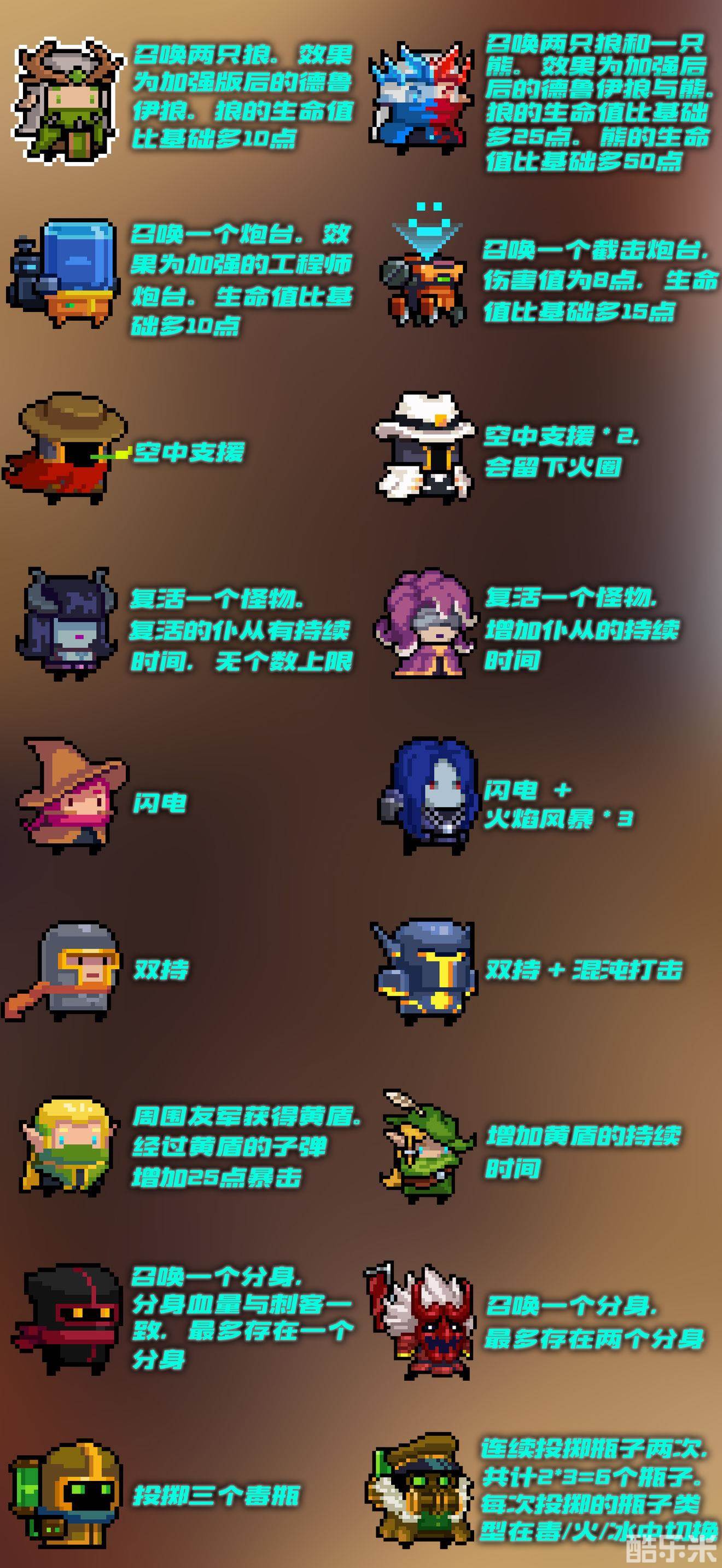 (下图中,左列图文为普通佣兵及技能描述,右列为高级佣兵及其技能描述。(3.0.1版本))