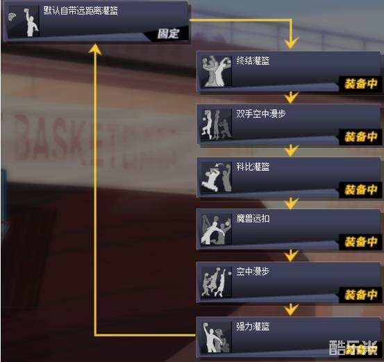 花式技能一共包含8类,所有人物通用的有近投、近上、运球。近投选择技能兑换券购买的高举投射,由于近投在实战中PF几乎没机会用,技能兑换券不是很充足的情况下,不装近投花式也没问题。近上方面,同样实战中用近上进攻的机会也不多,但是快速上篮2不能被C抓这一特性使他成为了必备,第3-5代超特即便有很强力的近上动作变更,也不能代替快速上篮2,这也是PF近上唯一的花式。运球也只有背后运球一个花式,可能一场也用不上一次。
