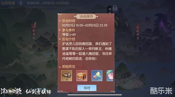在“决战拜月”玩法中,阁下将和仙剑的小伙伴们一起携手,进入南绍国阻止拜月教主的阴谋,还天下一个太平!在活动中,阁下可在活动中,通过日常玩法来搜索拜月教主以及他的教徒,挑战击败后可获得排名积分以及活动道具女娲石。
