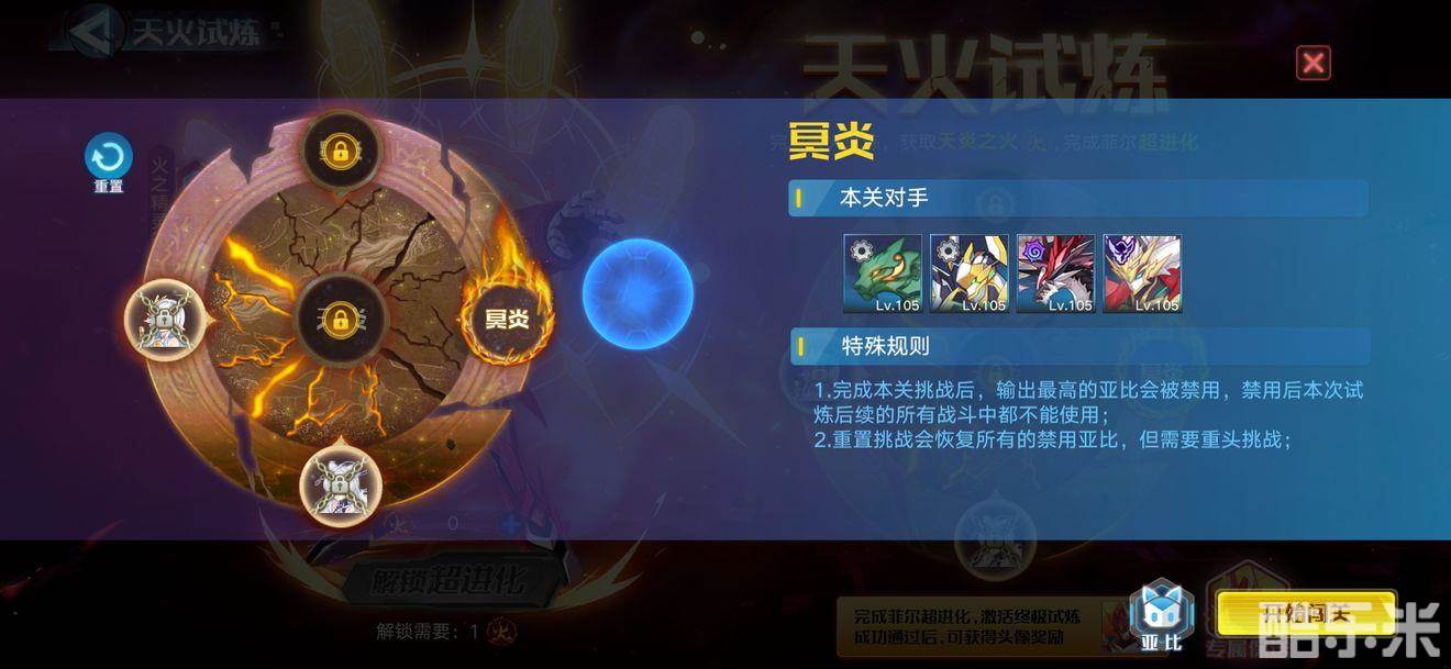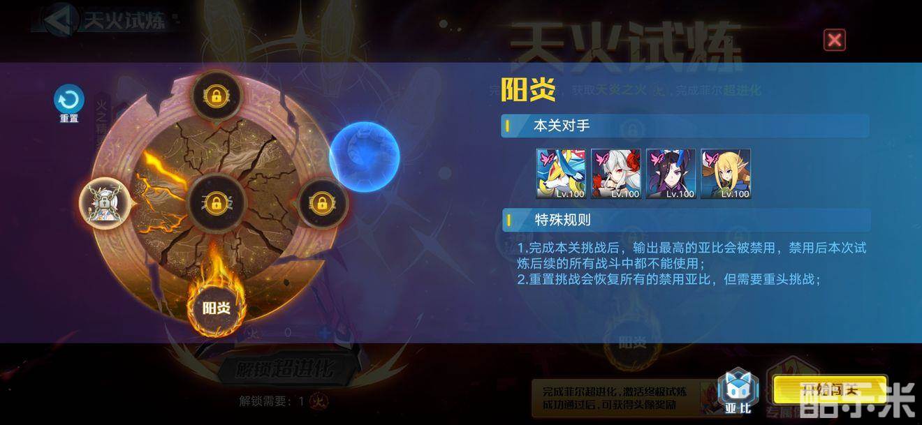 总结:全是光输出最高的亚比会被封住,然后第五关你要挑战前四关被封的亚比和菲尔,所以前面尽量使用光系或神秘系输出最高,后面好用132一一打掉。(难度不大,如果你没几只亚比的话,那可能有些麻烦)