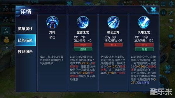 被动技能-龙鸣:每损失一定最大生命值获得额外的免伤效果。被动技能使得赵云团战中具有不错的防护性,随着自身血量的减少,赵云获得的免伤效果更多,也就是说赵云越到残血状态下,越能挨打,也就越强势,配合上半肉出装既能够保证强势的输出,也能强化赵云的生存性,让其具有更强的战场续航性。