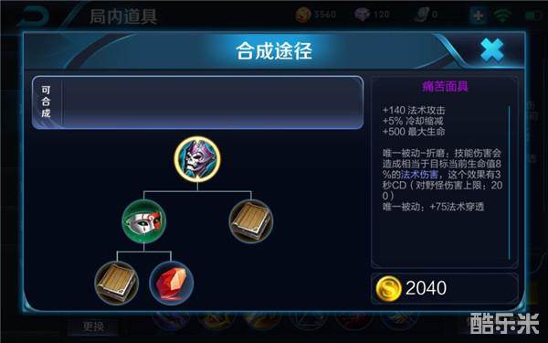 痛苦面具的属性加成比较全,有法术穿透、法术攻击、最大生命值与冷却缩减,其中冷却缩减和法术攻击对张良作用比较大。作为一名偏向于控制的法师,需要在实战中频繁的释放技能干扰敌人的行动。而被动的折磨能对目标造成百分比伤害,后期面对坦克也能轻松应对。