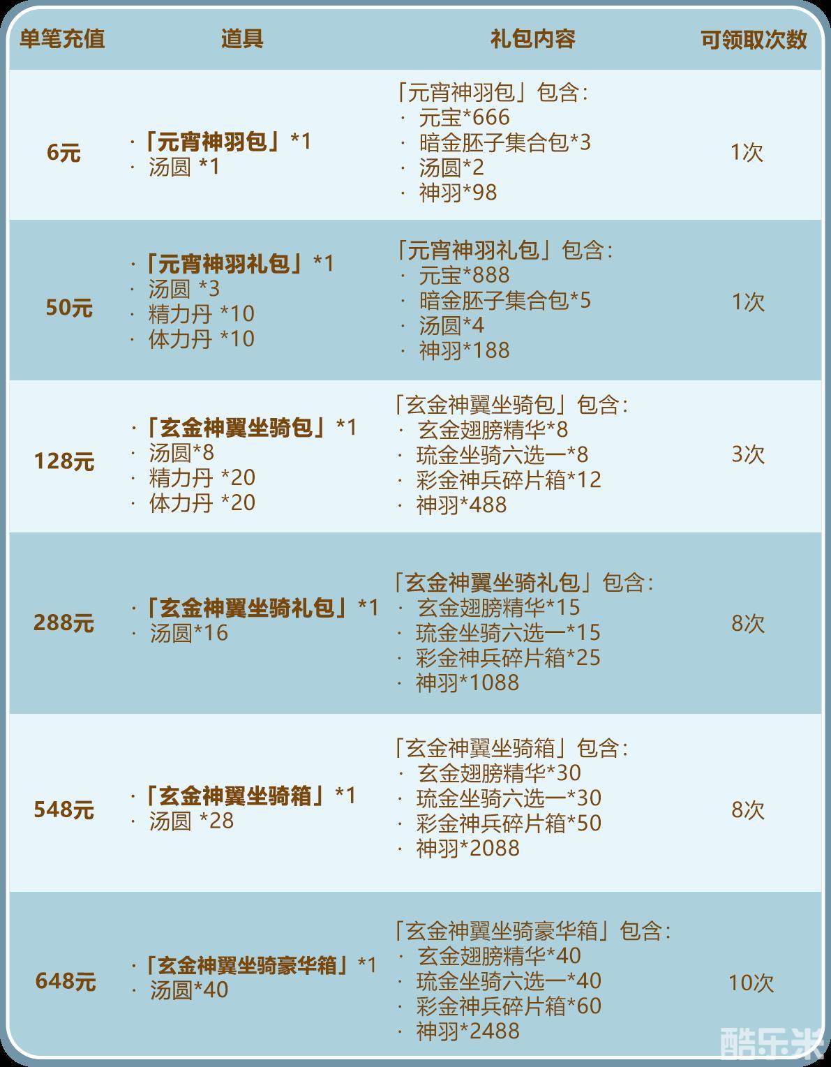 在活动期间少年们单笔充值至指定金额,即可获得玄金翅膀精华、琉金坐骑六选一、彩金神兵碎片箱、神羽、汤圆等资源: