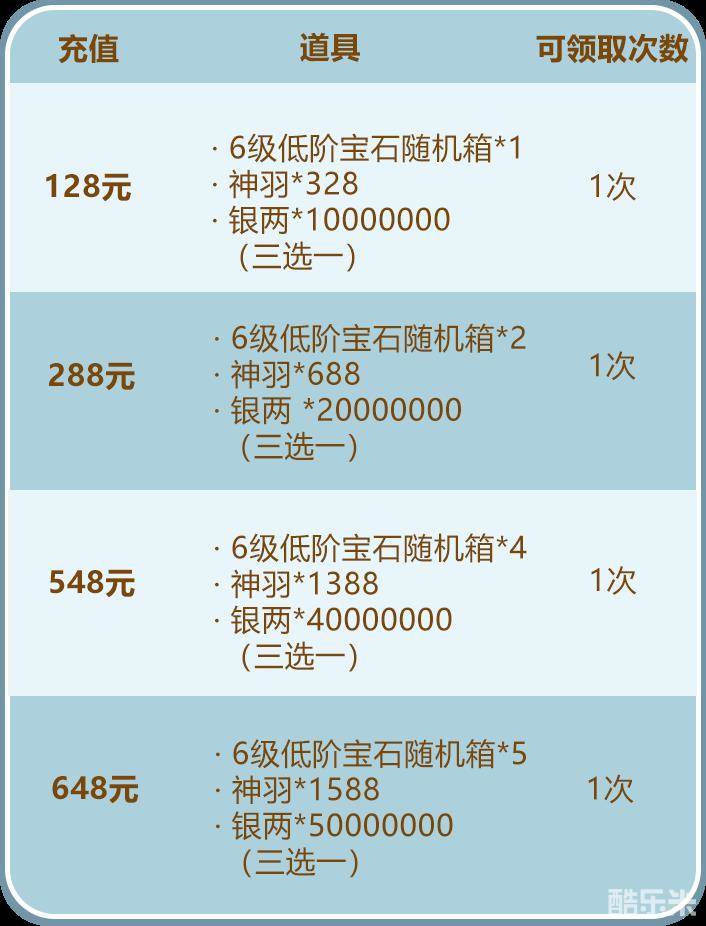 活动规则:在活动期间,7天内任意1天充值548及以上,都能立即激活周基金,领取当前天数所有奖励!7天内可获得如下奖励: