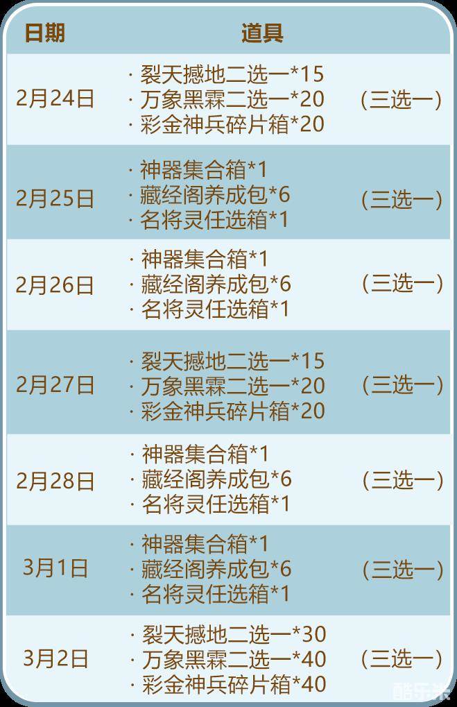 少年们能拿到丰厚的裂天撼地二选一、万象黑霖二选一、彩金神兵碎片箱、神器集合箱、藏经阁养成包、名将灵任选箱等资源哦~