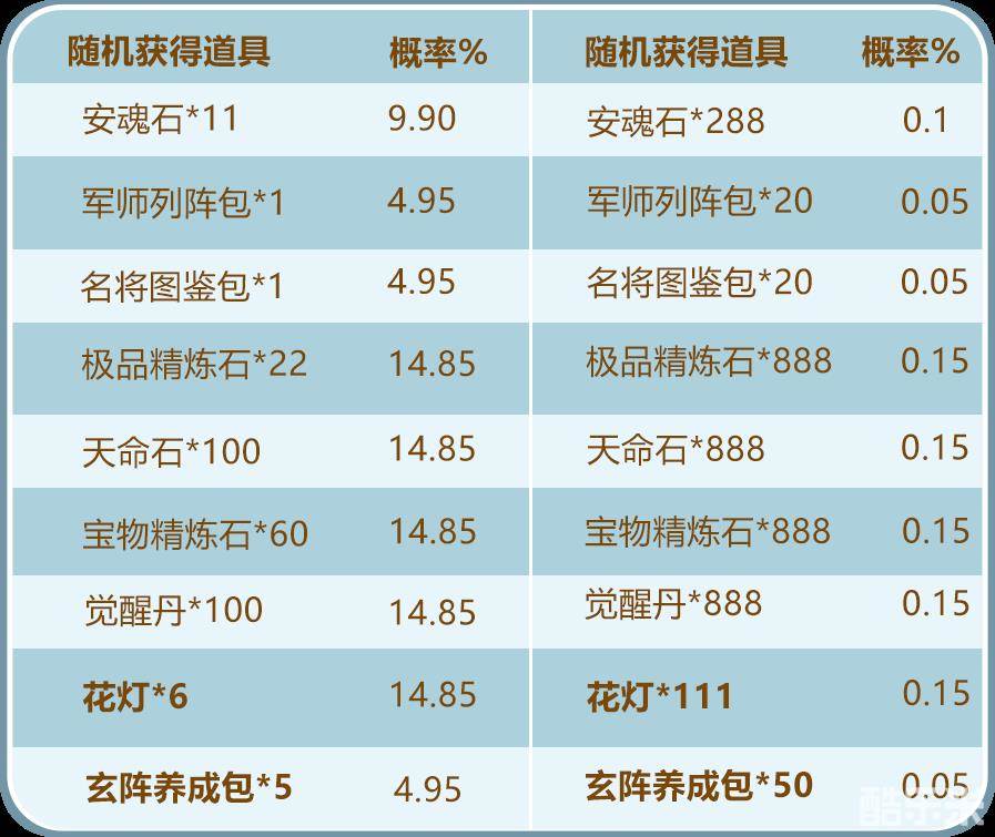 3.「元宵礼盒」可开出:花灯*111、玄阵养成包*50、觉醒丹*888、天命石*888、极品精炼石*888、安魂石*666、军师列阵包*40、名将图鉴包*40、宝物精炼石*888、花灯*6、玄阵养成包*5、觉醒丹*100、天命石*100、极品精炼石*22、安魂石*11、军师列阵包*1、名将图鉴包*1、宝物精炼石*60中的随机1种。