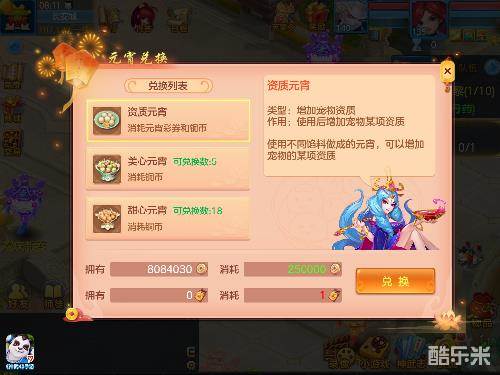 活动期间,可使用获得的元宵彩券,在花灯仙子处随机兑换四类资质元宵——芝麻元宵、桂花元宵、玫瑰元宵、山楂元宵,分别对应攻击、防御、法力、体力四项资质。