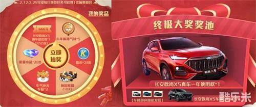 在2月26日0:00点前,车友们完成任务点亮完整终极奖券,就可以参与抽取长安欧尚X5真车一年使用权大奖及车模好礼,开启一年好运!