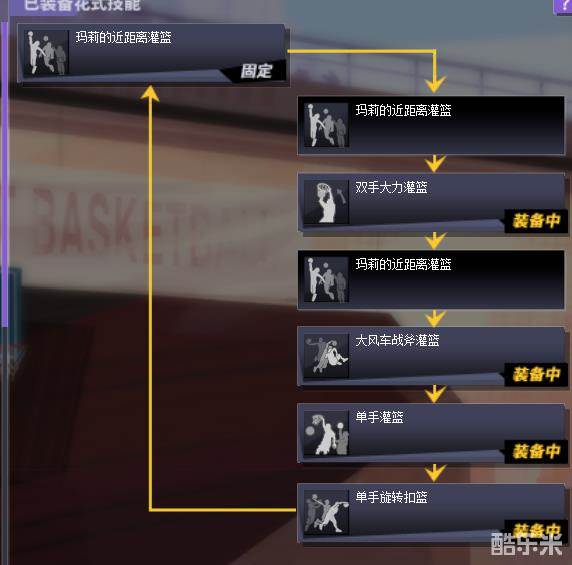 空中灌篮,空中接力灌篮的花式动作,众所周知,普通的空中接力灌篮很容易被毛,但是恰好这个花式动作,稍微降低了一些被毛的概率和减少了一部分盖帽的时机,这是个好技能,一定要装备。