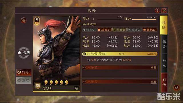 3、高顺自带兵刃“陷阵营”在作为主将是恢复能力很靠谱,这一点也是高顺最大的优点,虽然高顺智力不高,但恢复总量还是很给力的。特别是对于平民玩家前期拆不到“坐守孤城”这样的4星神恢复战法时,高顺的强制恢复就显得尤为亮眼。