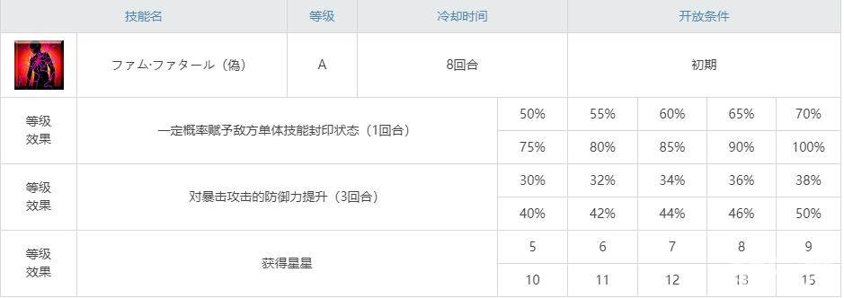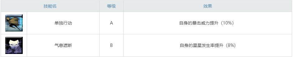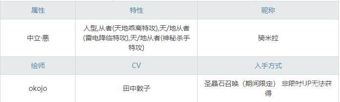 作为本次泳装活动登场的水米拉,阶职为骑阶,QQAAB+绿卡光炮。宝具拥有赋予敌人强化无效的状态,减少从者的输出能力。一技能同样可以指定并封印敌方技能,满级效果为100%,若敌方是依赖技能的类型,则很好的控制其输出手段,同时赋予自身暴击伤害减少的能力,保证自己不会被一套带走。二技能可以使己方全体在一回合之后增加NP,满级增加25%NP,骑阶少有的充电宝。三技能在保证自己恢复的同时削弱敌方的防御,加上本身较为优秀的白值,可以配合队友或者辅助队友打出不错的伤害。常规输出较低,唯一的生存手段仅为一回合内一次回避的效果,二技能还有赋予敌方目标集中状态的副作用。