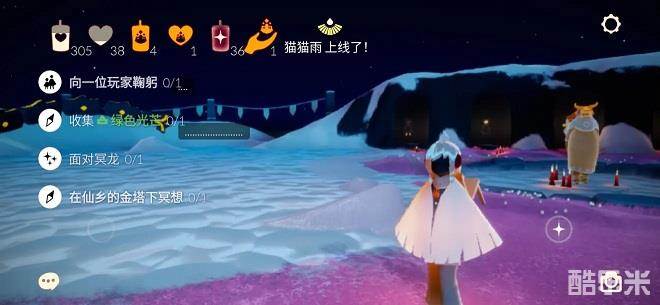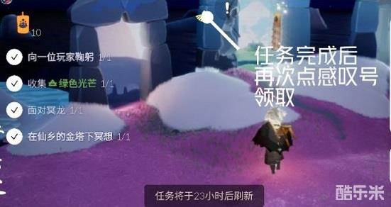 除了这个任务以外,今天光遇的日常任务还包括向一位玩家鞠躬、收集绿色光芒和面对冥龙。
